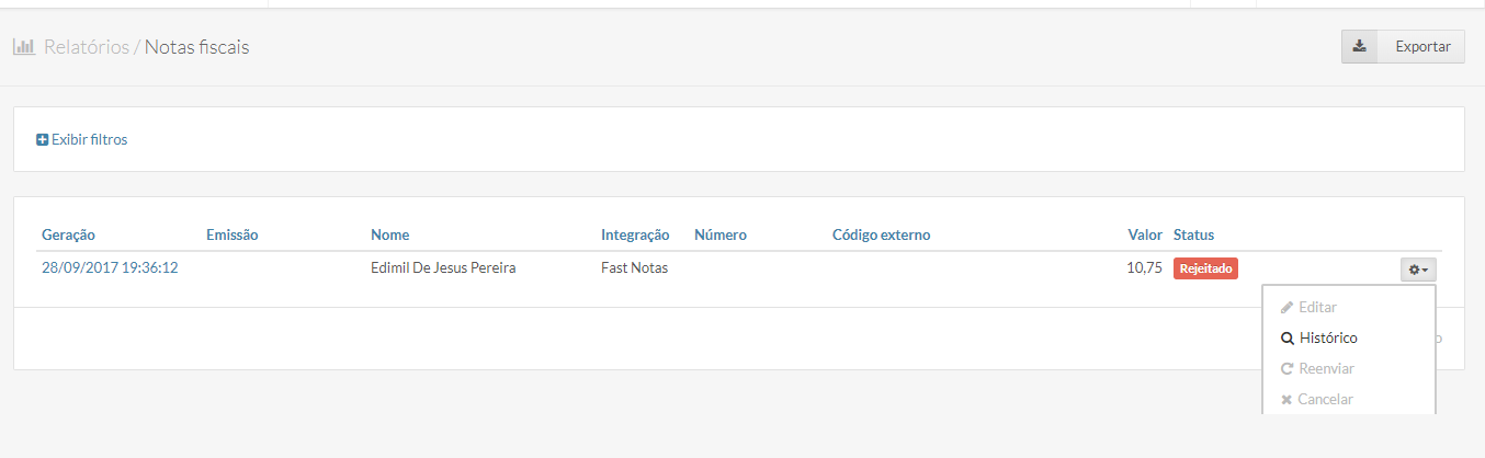 Ao clicar no alerta, você será direcionado para o relatório de Nota Fiscal. Nele está a lista de todas as notas rejeitadas.