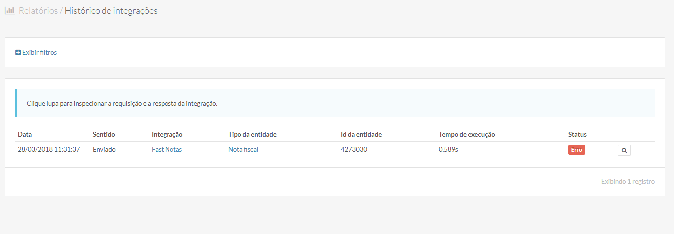 Na página do histórico, você encontrará detalhes de cada nota, como data da geração, ID da entidade e tempo de execução.