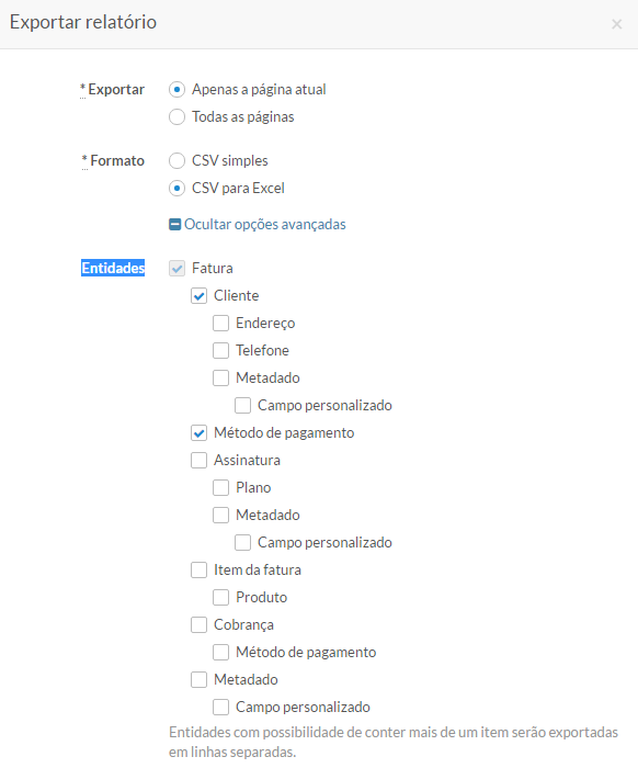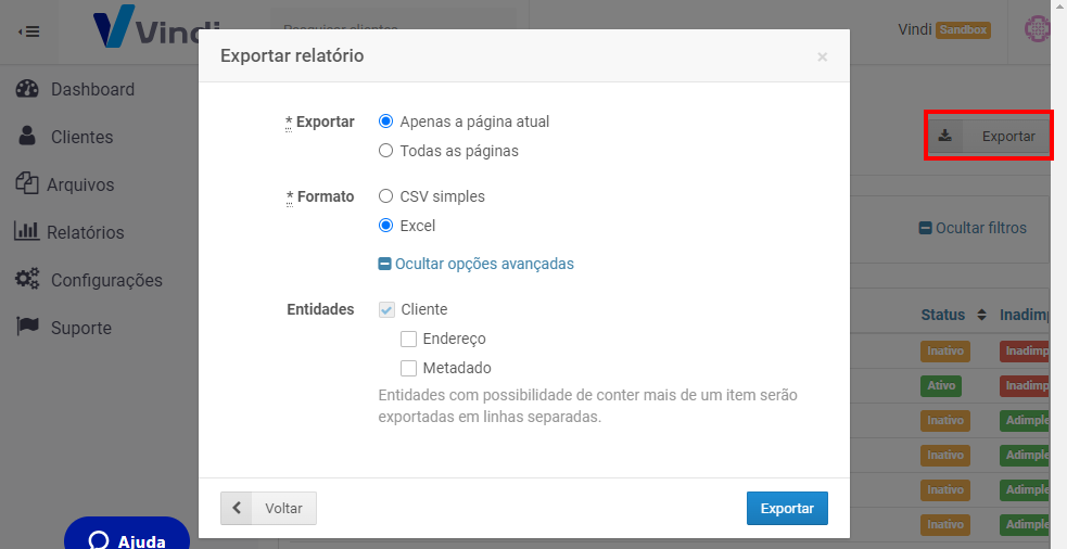 O botão exportar agora está localizado no lado esquerdo acima da lista de cobranças. Usando essa opção, você poderá exportar todos os registros de cobranças, no formato CSV simples ou Excel. Terá também, a opção de exportar as opções básicas ou customizadas (onde você poderá selecionar mais campos para exportação).