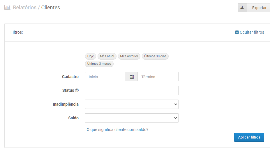 Observação: Para visualizar clientes que possuem algum tipo de saldo, é necessário exportar o relatório. Essa opção não aparece nos resultados dentro da plataforma.