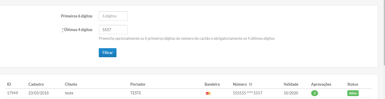 O filtro é bem simples. A busca pode ser realizada pelos 4 últimos dígitos do cartão ou pelos 6 primeiros.