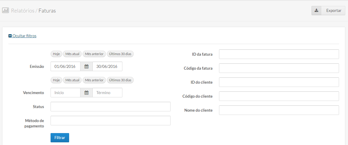 Por meio desse relatório é possível realizar o acompanhamento de suas faturas. Para gerar este relatório acesse "Relatórios" no menu lateral e selecione "Faturas":