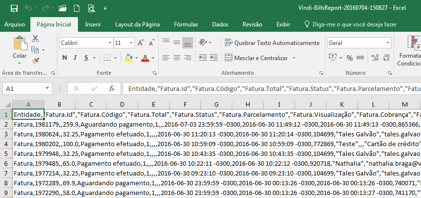 - Pagamento: A data do pagamento da cobrança. Quando não tiver sido paga ainda, ficará escrito "não efetuado";