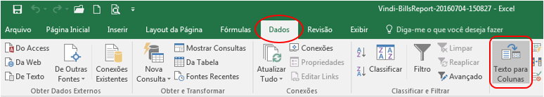 No menu superior, clique em “Dados” e depois em “Texto para Colunas”: