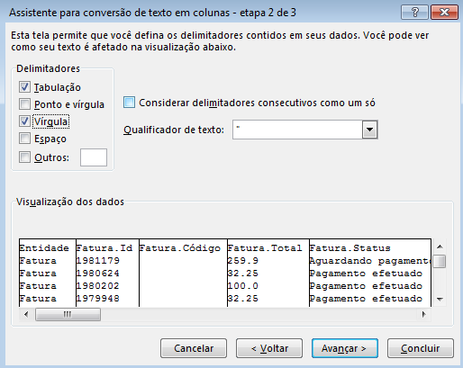 Na tela seguinte, marque “Vírgula”. Você verá que os dados serão separados em colunas. Clique em “Avançar” e na tela seguinte clique em "Concluir":
