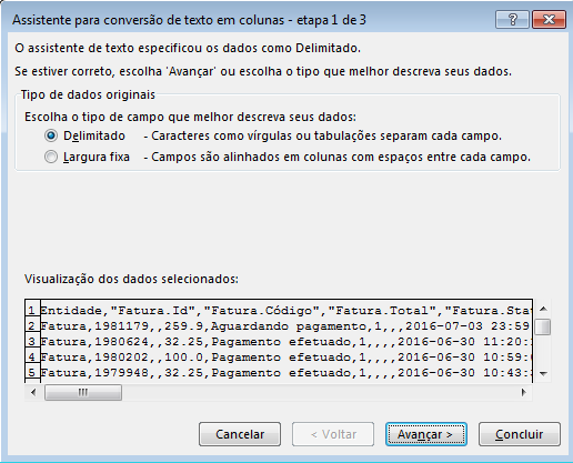Abrirá a caixa abaixo. Deixe marcado “Delimitado” e clique em “Avançar”: