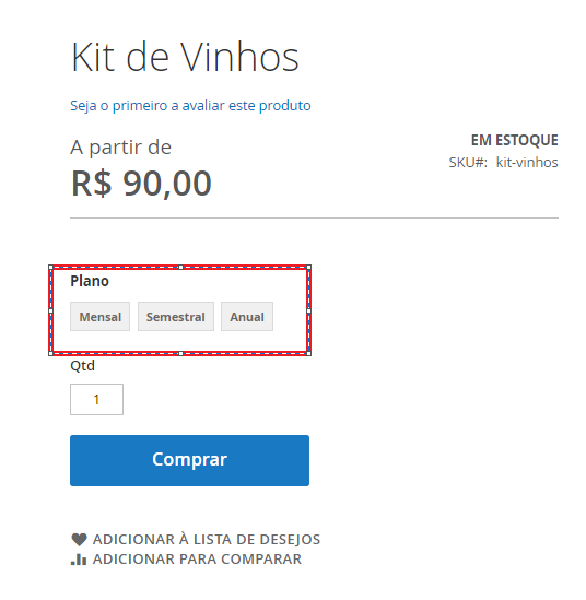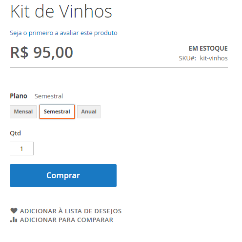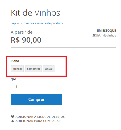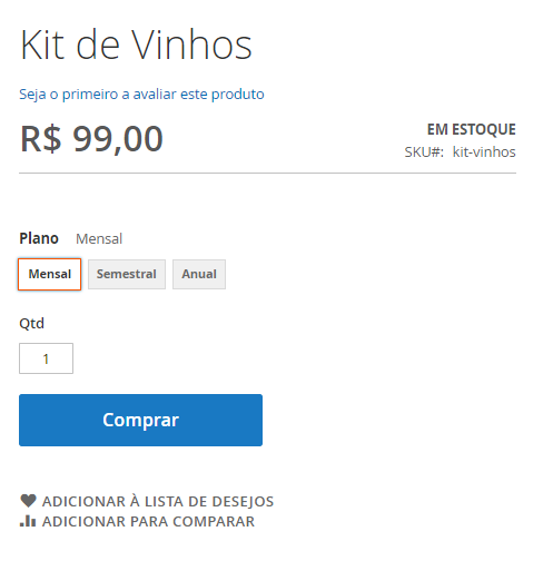 Após habilitar a recorrência, é só escolher o plano desejado. É possível escolher mais de um plano. Todos os planos selecionados aparecerão na sua loja junto ao produto, conforme a imagem abaixo.