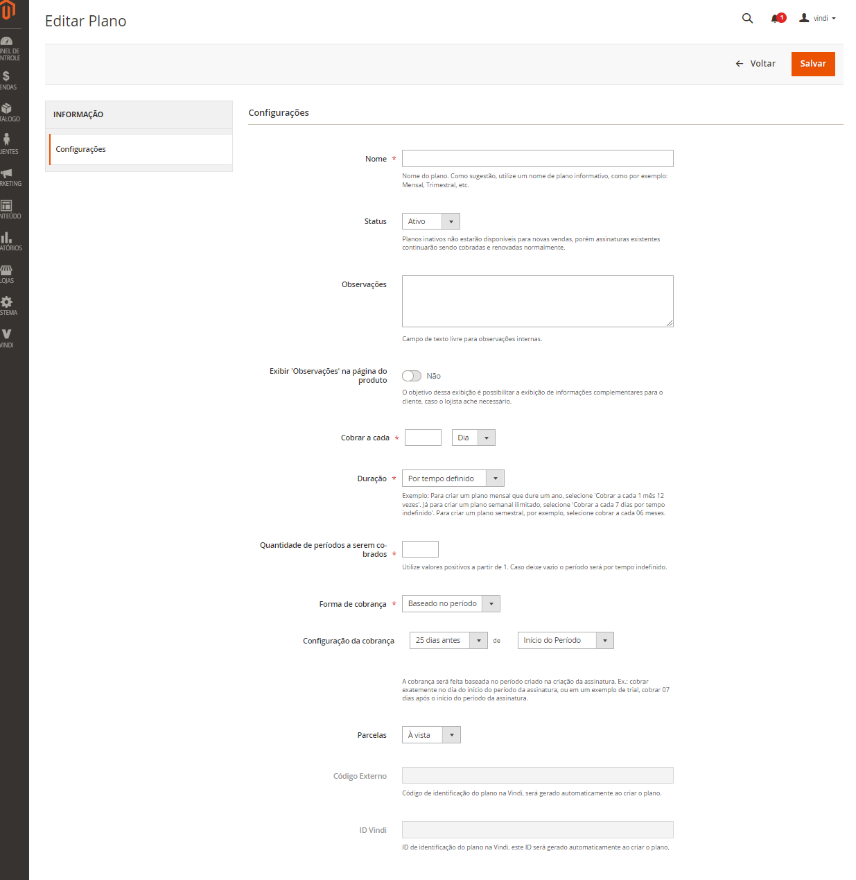 - O formato de preenchimento ocorre conforme a plataforma da Vindi Recorrência. Portanto, para entender o funcionamento dos demais campos, leia Como eu faço para criar e configurar os Planos?;