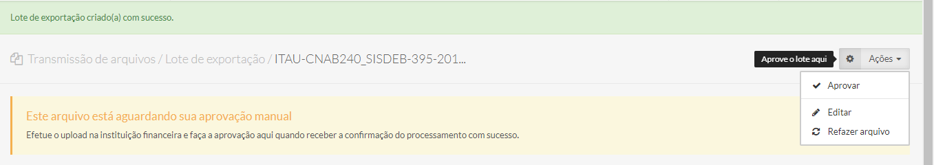 Refazer arquivo: Se acontecer a rejeição da remessa pelo seu banco e o lote estiver aguardando aprovação, você pode realizar as alterações necessárias, refazer o arquivo e baixar uma nova remessa.